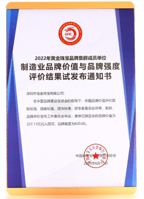大会期间,试发布了“2022年黄金珠宝品牌集群成员单位品牌价值与品牌强度”评价结果,云顶国际集团珠宝品牌价值227.17亿元,品牌强度830.60。